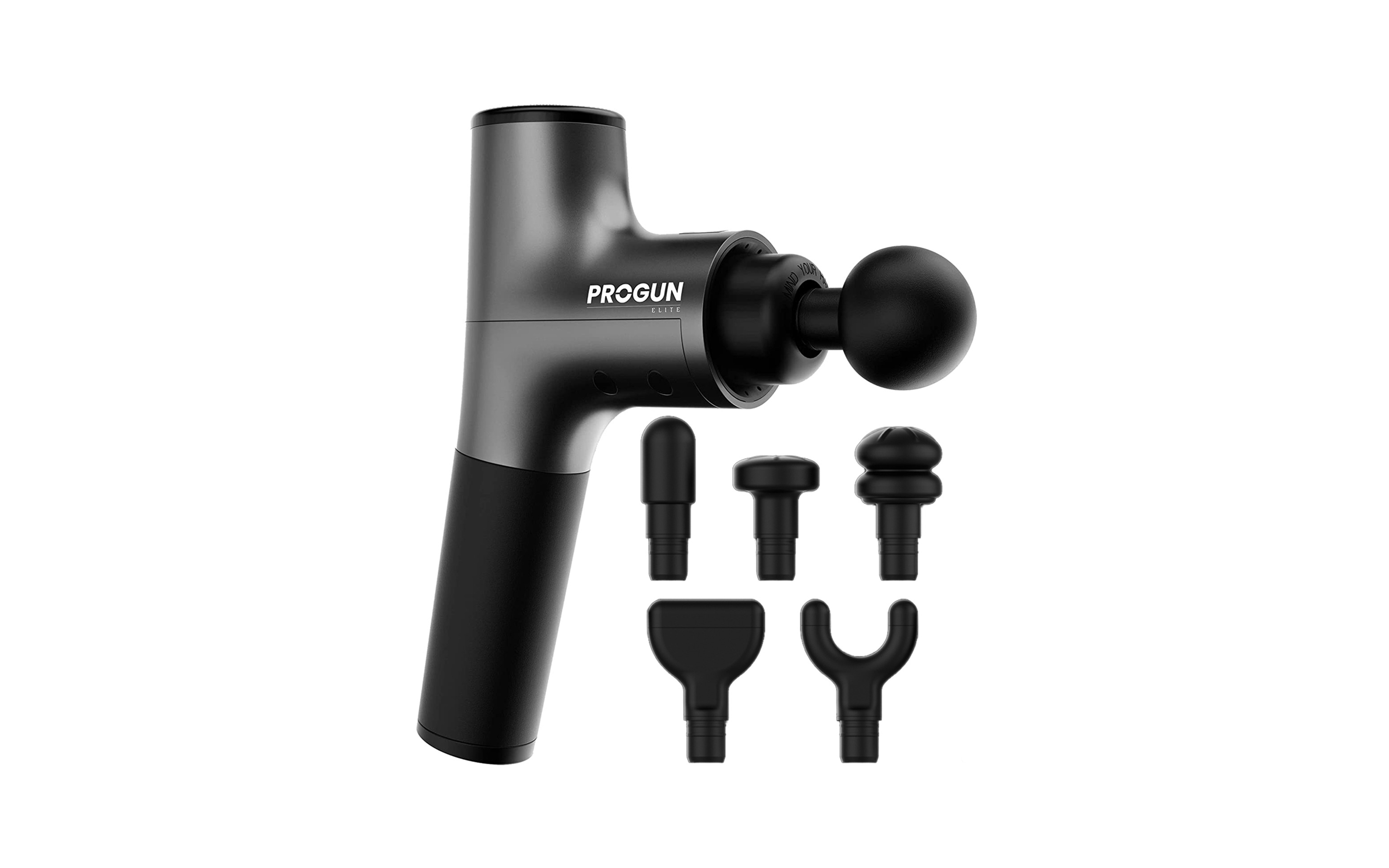 The PROGUN Elite is an advanced percussion massage gun designed to reduce muscular discomfort and boost physical performance. Equipped with a high-powered 75W brushless motor, noise attenuation technology, and a 26V Lithium-ion battery for 6 hours of uninterrupted use, the Elite features 3 speed modes, a 14mm amplitude for precision and control, OneTouch Control, PROGLIDE technology, and attachments for target muscles. A rugged case completes the package.